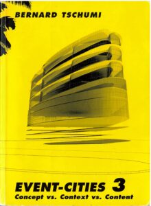 In Event-Cities 3, Bernard Tschumi explores the complex and productive triangulation of architectural concept, context, and content. There is no architecture without a concept, an overriding idea that gives coherence and identity to a building. But there is also no architecture without context—historical, geographical, cultural—or content (what happens inside). Concept, context, and content may be in unison or purposely discordant. Against the contextualist movement of the 1980s and 1990s, which called for architecture to blend in with its surroundings, Tschumi argues that buildings may or may not conform to their settings—but that the decision should always be strategic.