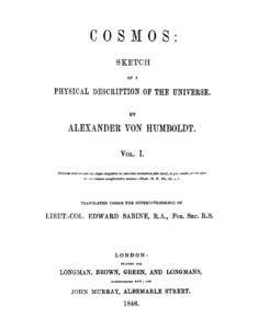 Cosmos: A Sketch of a Physical Description of the Universe is an influential treatise on science and nature written by the German scientist and explorer Alexander von Humboldt. Cosmos began as a lecture series delivered by Humboldt at the University of Berlin, and was published in five volumes between 1845 and 1862 (the fifth was posthumous and completed based on Humboldt’s notes). In the first volume of Cosmos, Humboldt paints a general “portrait of nature”, describing the physical nature of outer space and the Earth. In the second volume he describes the history of science.